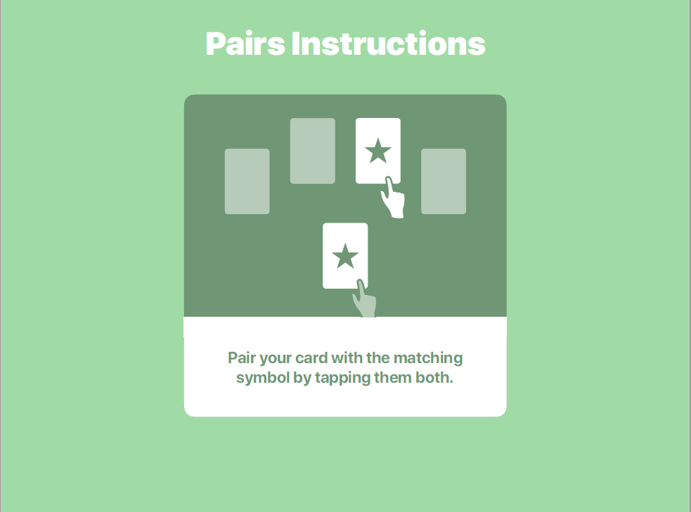 We were inspired by our users to develop a card game, everyone loves cards. We wanted to test memory too though. So we came up with Pairs. You have to check your own card, then match it to the deck that is dealt out, one at a time. You will need to look at the dealt cards and remember them. Tap one at a time to pair them off. Don’t worry if you get one wrong, you can keep going.