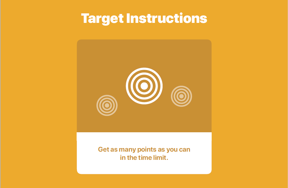 To start playing, we recommend you start with the Target Game. This was the original game designed for the App, when we wanted something simple that could bring hand and eye coordination together. Its really simple, just tap the target rings as they appear to get a high score. We have found this is remarkably playable, even for people with advanced Macular Degeneration.